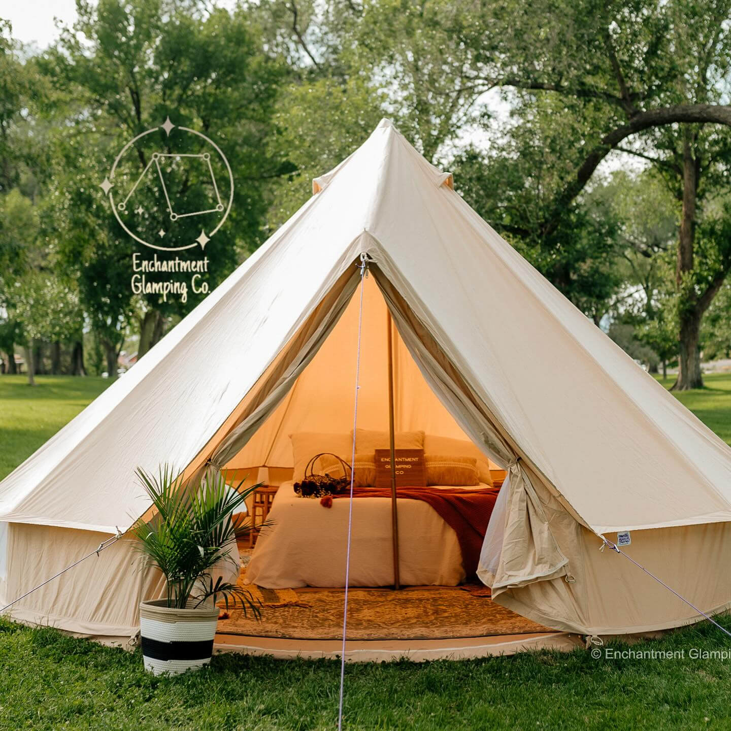 Glamping 16 x 16 bell tent w/ two queen beds (5 available): suitable for 3-4 people: Enjoy the retreat in style! Your Glamping accommodation comes with a fully set up, 16-foot (diameter) luxury white canvas Bell Tent. The tent is equipped with a deluxe rug, 2 comfortable queen-size beds that are elevated off the ground, all necessary linens, a comforter, 2 pillows, a side table, and a battery-powered lamp. Additionally, there will be 110 Volt electricity for extra lighting and low-power devices. Upon arrival, simply present your ticket, and a shuttle will transport you to The Magical Forest glamp-ground. Please note a credit card is required upon check-in for a damage deposit.